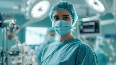 Female surgeon is standing in a modern operating room wearing scrubs and a mask