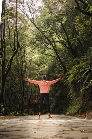 Rear view of man on footpath in laurel forest. Anaga national park in mysterious fog. Tenerife, Spain.