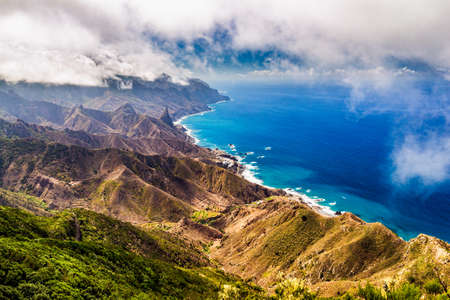 Beautiful landscape of green mountains and cliffs. View from Mirador Bailadero viewpoint on coast and Atlantic Ocean. Blue sunny sky with clouds. Anaga Rural Park, Tenerife. Canary Islands, Spain.