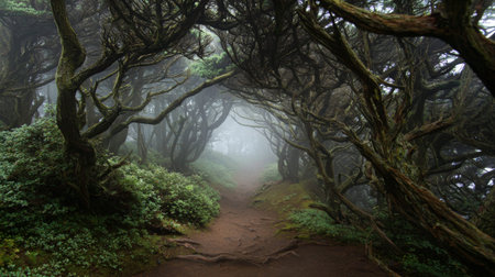 A captivating pathway canopied by twisted trees in a foggy forest, creating a serene and mystical atmosphere perfect for nature enthusiasts and adventurers.