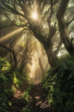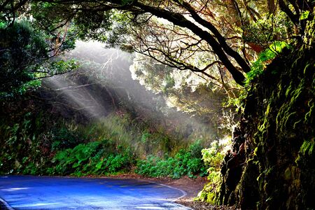 Landscape view of wild pathway through forest with sunrays, Anaga, Tenerife