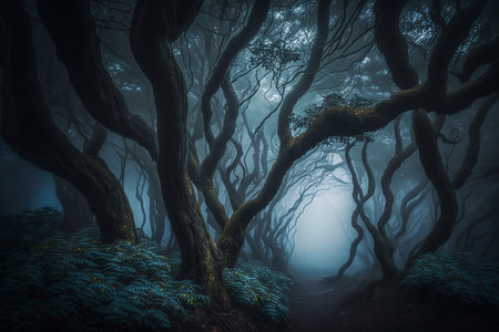 AI Generated. The ominous forest path is lined with twisted t bushes and tangled vines Every step forward feels like a step deeper into the unknown and potentially dangerous