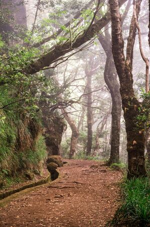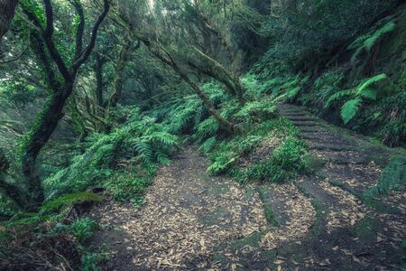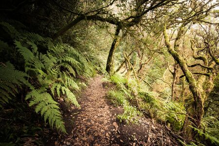 Relict forest on the slopes of the oldest mountain range of the island of Tenerife. Giant Laurels and Tree Heather along narrow winding paths. Paradise for hiking. Fish eye postcard. Canary Islands..