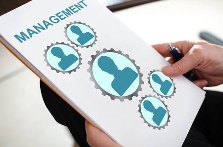 Multiethnic group of young people standing in front of a wall with the word MANAGEMENT