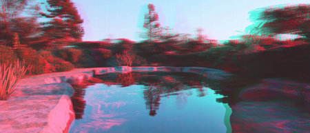 Glitch art with chromatic aberration showcasing distorted colors around a tranquil pond