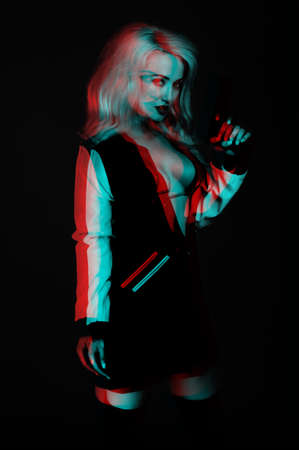 Futuristic woman. Party look. Model shooting. Sexy woman elegant dress posing isolated light black white photo red green pixel glitch effect defocused copy space.