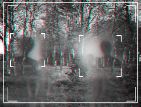 Alien, extraterrestrial and viewfinder on a camera display to record a living organism in area 51. Camcorder, sighting and conspiracy with a life form on a recording screen outdoor in the forest