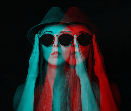 Beautiful stylish young woman in glasses and hat. Image with 3d, stereo anaglyph effect.