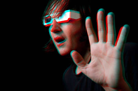 Scared man with anaglyph glasses watching a 3D movie, anaglyph image