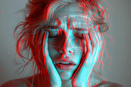 A mockup featuring a female face with a glitching anaglyph photo effect. The image gives a distorted, futuristic, and 3D visual style, perfect for modern and edgy designs.