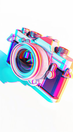 Classic film camera with glitchy pink and blue tones, capturing a retro and artistic aesthetic in a white backdrop