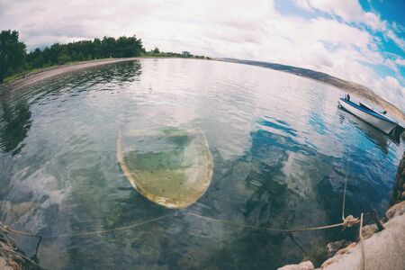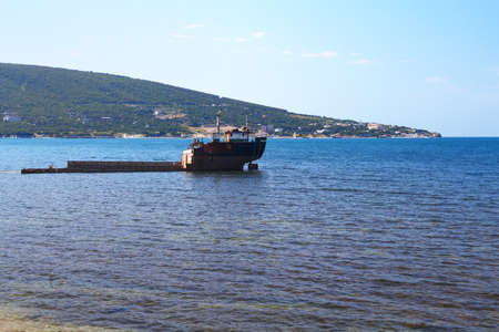 Unknown semi-submerged rusted and destroyed barge stranded in a bay on the Black Sea. Kabardinka, Krasnodar region, Russia