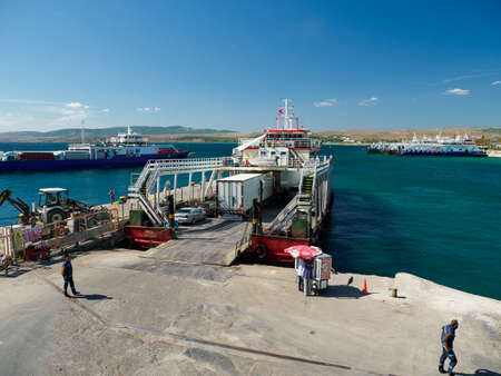 Canakkale, Turkey - October 05, 2018: The ferry with trucks, cars and passengers on board preparing to cross Dardanelles Strait in Canakkale, Turkey.