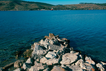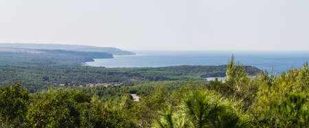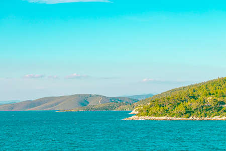Amazing Aegean coast view with beautiful sky and green land. summer natural landscape.