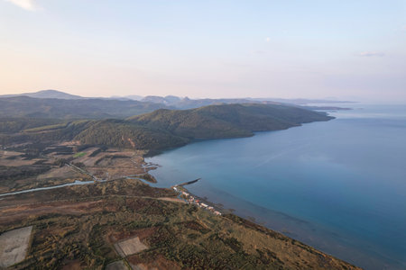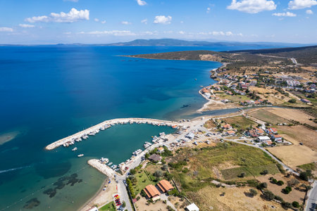 A distant view of Urla Balıklıova, formerly called Polikhne and located in İzmir, the pearl of the Aegean region. Drone view of Balikliova, Urla Izmir. Turkey