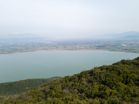 Picturesque aerial view of a lake from a green hillside, capturing the beauty of nature.