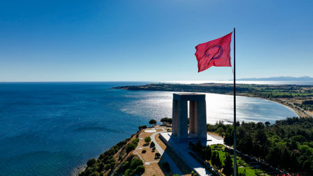 Canakkale / Turkey - May 29, 2024 / Dur Yolcu (Traveller halt, The soil you tread, Once witnessed the end of an era) memorial aerial view in Canakkale,