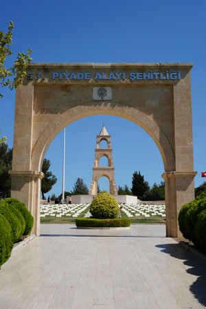Canakkale, Turkey - July 01-2021 : Canakkale Martyrs Memorial military cemetery is a war memorial commemorating the service of about Turkish soldiers who participated at the Battle of Gallipoli.