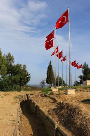 Trenches in Gallipoli Turkey used in the first world war with Turkish flags waing