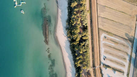 Sea with a strip of land and a lake on an autumn day, top view. Beauty of nature, landscape.