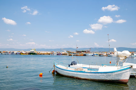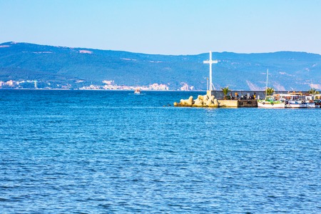 Nessebar, Bulgaria - July 25, 2016: Cross, port and boats view in Nesebar in Bulgaria