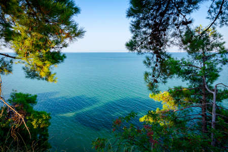 Above view through conifer canopy from reef on beautiful shallow turquoise water
