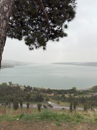 Scenic view of the Tbilisi Reservoir on cloudy day, with pine trees in the foreground and calm water stretching into the misty distance, creating a tranquil and moody landscape