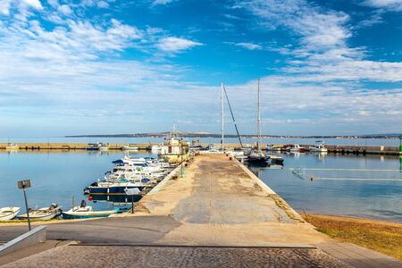 Harbor with docked boats in Privlaka village in the Zadar County of Croatia, Europe.