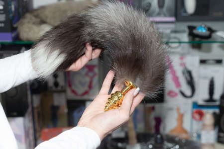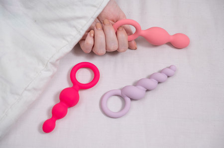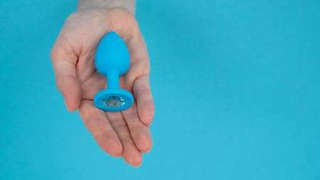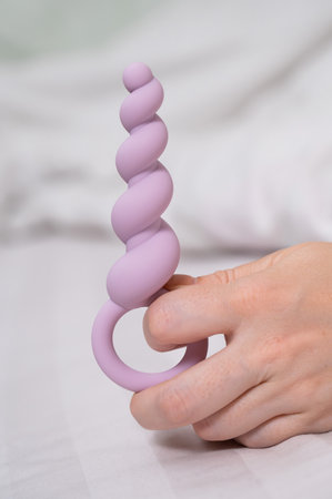 butt plug in the hands of a girl on the background of her Breasts in her bra