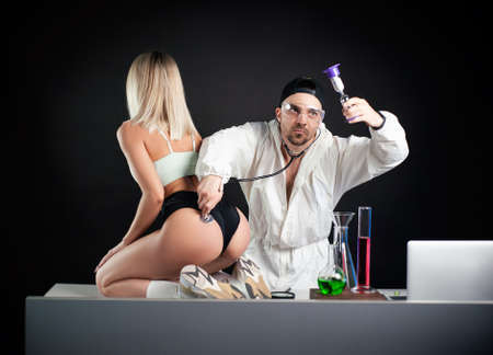 guy lab assistant doctor listens to buttocks sports fitness women with a stethoscope