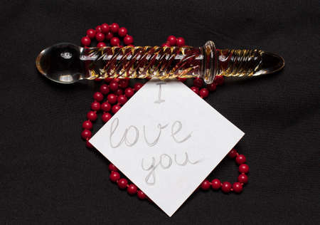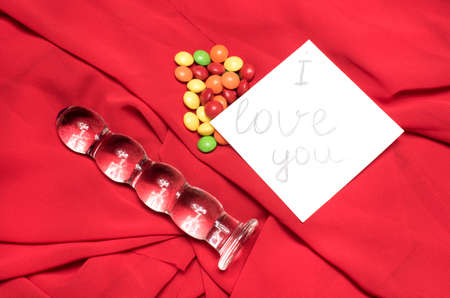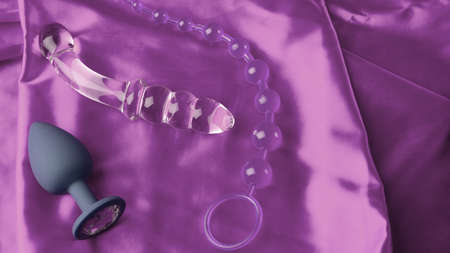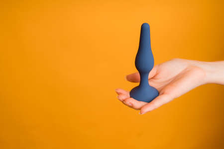 Adult sex toys, butt plug on an orange background. Anal dildo, butt plug in paper bag.