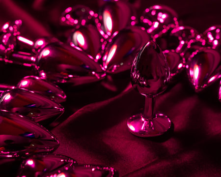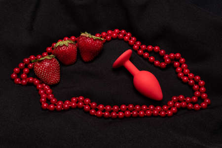 Red silicone smooth anal plug, sex toy, on a black background in the shade. Contrast photo of anal toys, erotic toys