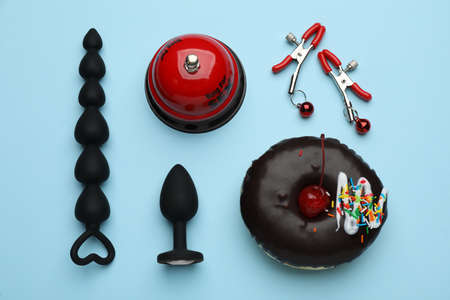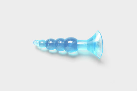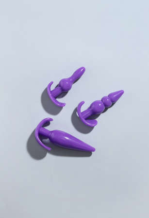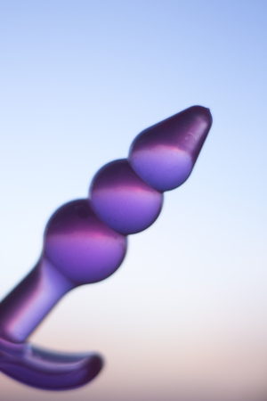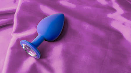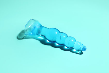 Blue buttplug sex toy on a colorful background. Photo of anal toy for adult with contrast shadows