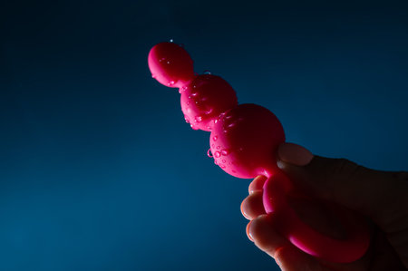 Woman holding pink anal beads in drops of water on a blue background. Sex toy hygiene concept.