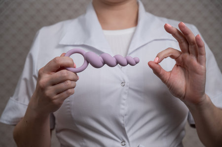 A man at a proctologist's appointment. The doctor holds a rectal suppository before entering the anus. Hemorrhoids or prostate treatment concept.
