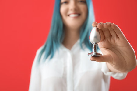 Beautiful young woman with anal plug sex toy on red background, closeup
