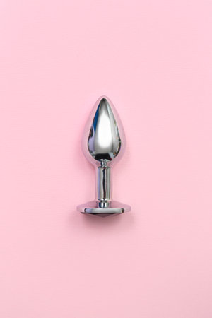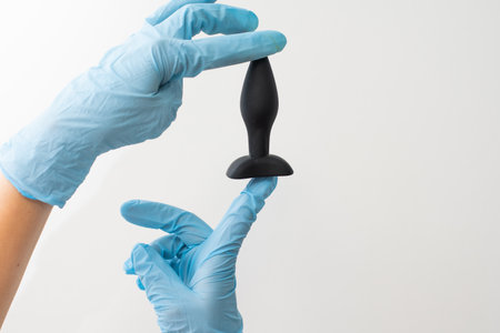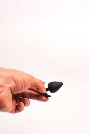 Top view of black butt plug and bottle of lubricant on white background. Safe anal sex concept
