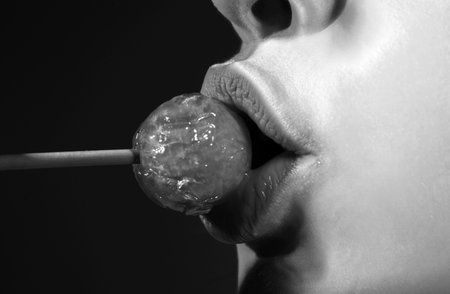 Sucking lips. Closeup female lips with pink lipgloss holding in mouth red lollipop candy. Lollipop on a face.