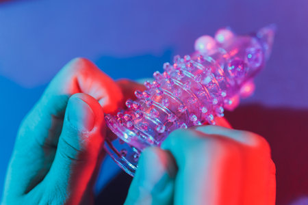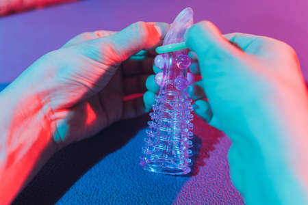 Rubber latex condom male contraceptive on dildo vibrator penis sex toy.