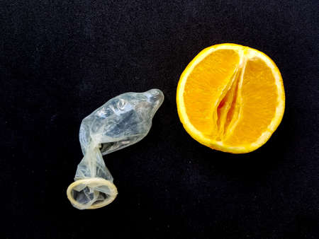 The concept of safe sex and protection. A vagina symbol. A juicy orange and a condom on a black background. High quality photo