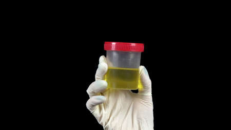 Urine in a test jar close-up. The doctor holds a jar in a glove on a black background.