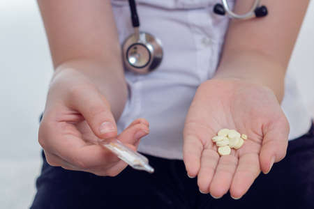 The doctor holds pills in his hands