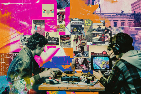Minimalistic mixed media collage showcasing technology and vibrant textures in harmonious design