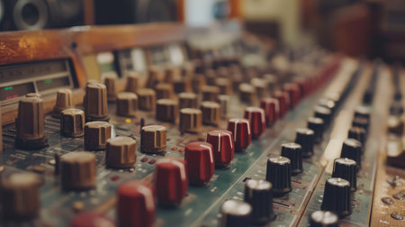 Detail with adjusting knobs on a professional audio mixer and music equipment for sound mixer control, electronic device.