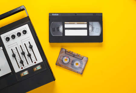 Retro flat lay. Audio magnetic tape reel, audio and video cassette, vinyl plate on yellow background. top view. 80s