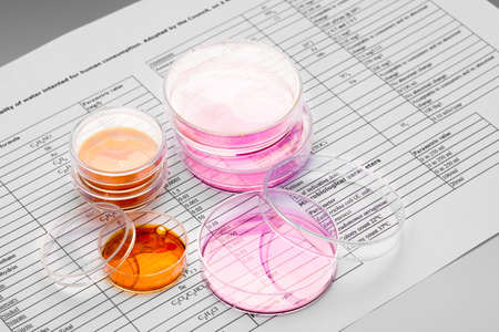 Petri dishes, test tubes and laboratory equipment, with coloring liquids. Concept of science, laboratory and study of diseases. Coronavirus (COVID-19) treatment developing.