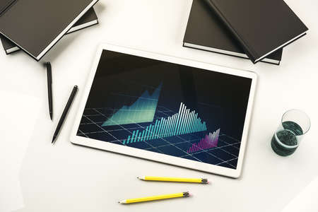 Modern digital tablet screen with abstract financial diagram, banking and accounting concept. Top view. 3D Rendering