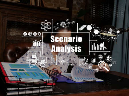 Financial concept about Scenario Analysis with inscription. Young finance market analyst in eyeglasses working while sitting at wooden table on background.