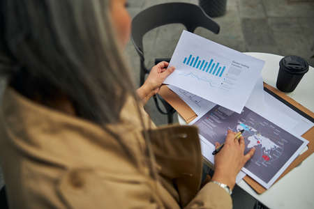 Close up of woman with pen in her hand studying graphs and charts while sitting at the table with papers and cup of coffee