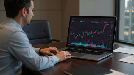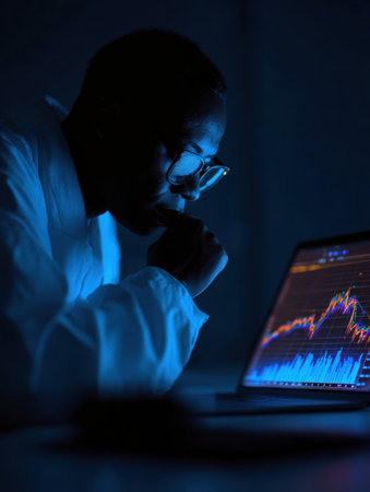 Focused analyst analyzes financial trends on the laptop screen while surrounded by a dark workspace, creating a calm, concentrated atmosphere.